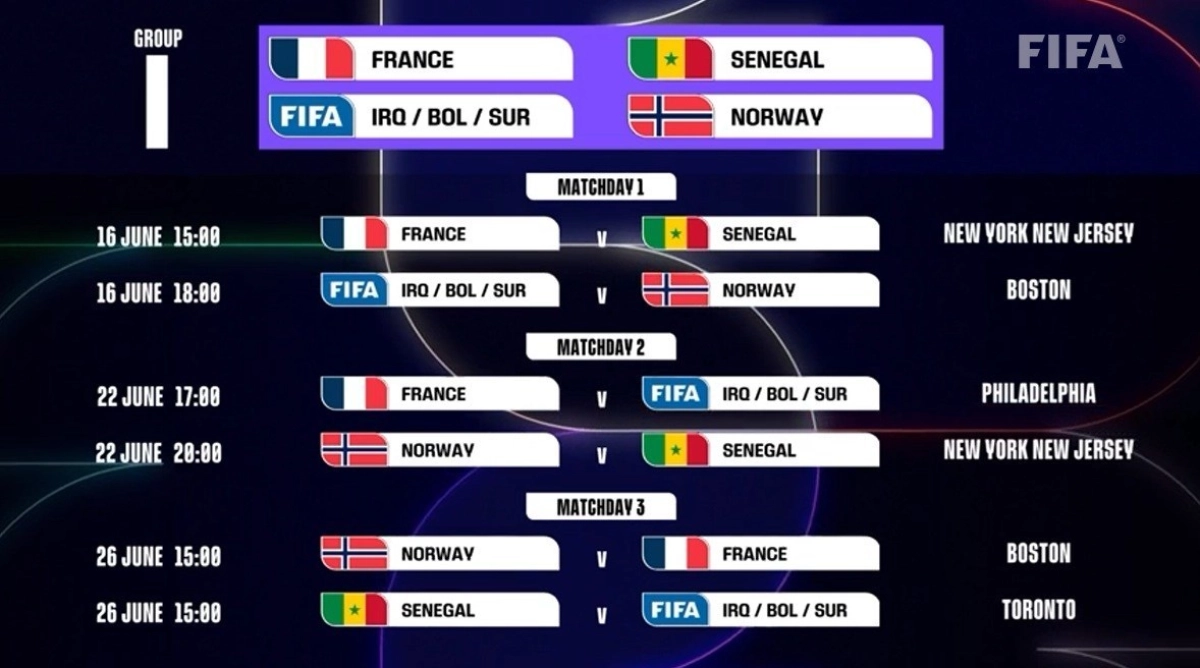 فرانسه - برنده پلیآف(عراق/بولیوی/سورینام)؛ 2 تیر؛ ساعت 00:30؛ فیلادلفیای آمریکا