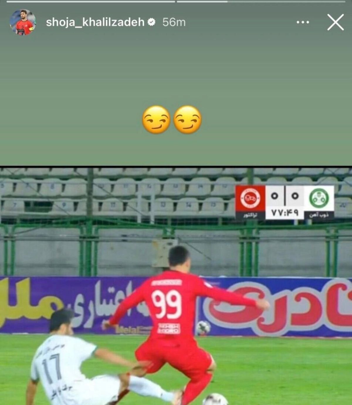 شجاع خلیلزاده، کاپیتان تیم تراکتور، با انتشار تصویری در صفحه اینستاگرام خود، به یک صحنه جنجالی در دیدار تیمش مقابل ذوبآهن اشاره کرد و از داور مسابقه به دلیل عدم اخراج جلال علیمحمدی انتقاد کرد.