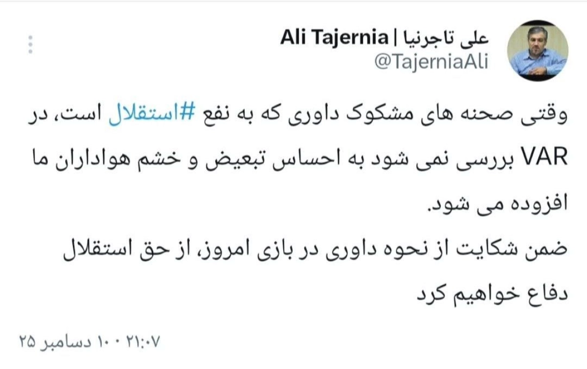 به گزارش سایت رسمی فوتبال برتر ؛ علی تاجرنیا، رئیس هیئت‌مدیره باشگاه استقلال، پس از تساوی یک–یک این تیم مقابل ملوان و حواشی گسترده پیرامون عدم اعلام پنالتی روی صالح حردانی، با انتشار پیامی تند در شبکه‌های اجتماعی به عملکرد داوران و اتاق VAR اعتراض کرد.