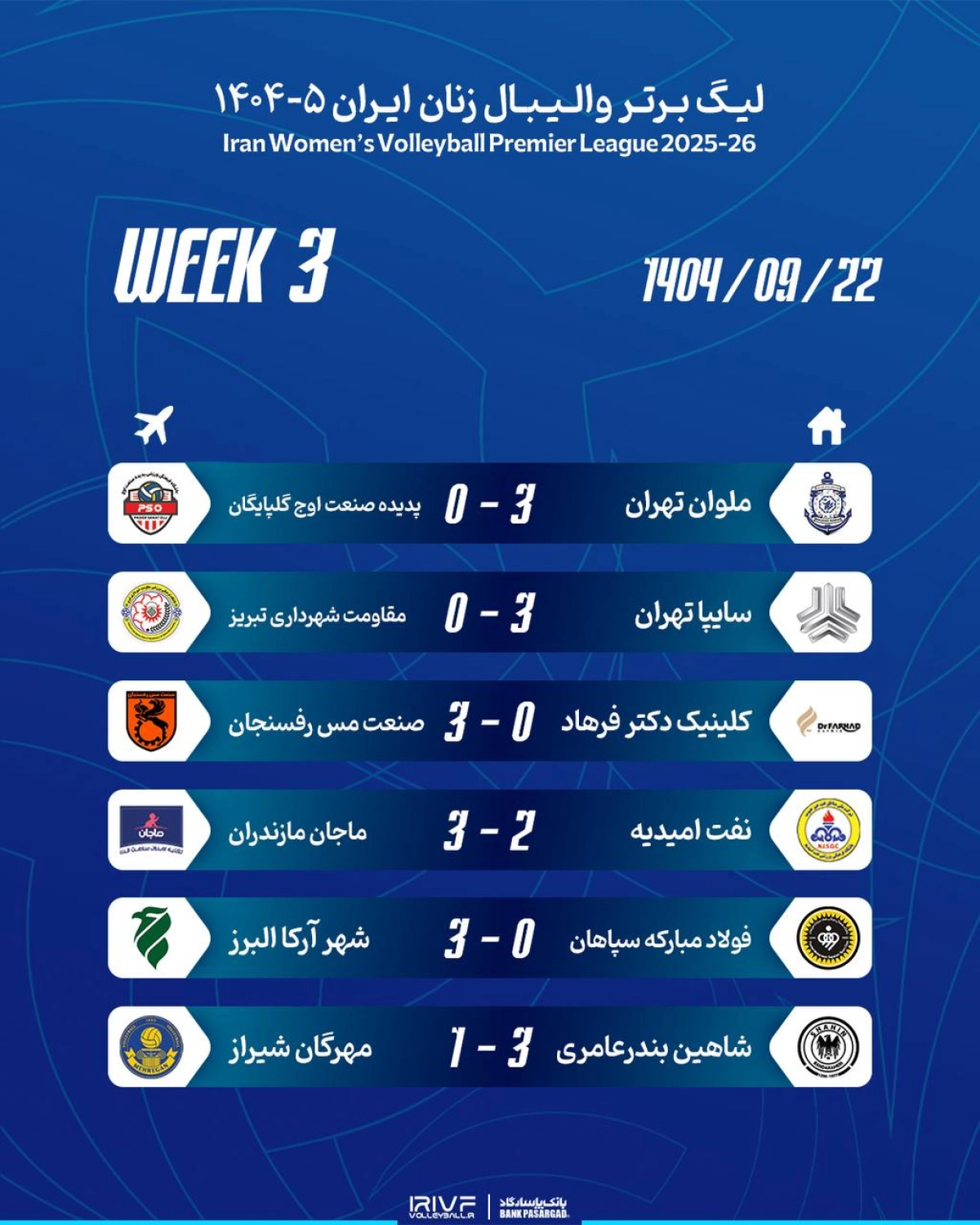 نتایج کامل هفته سوم لیگ برتر والیبال زنان