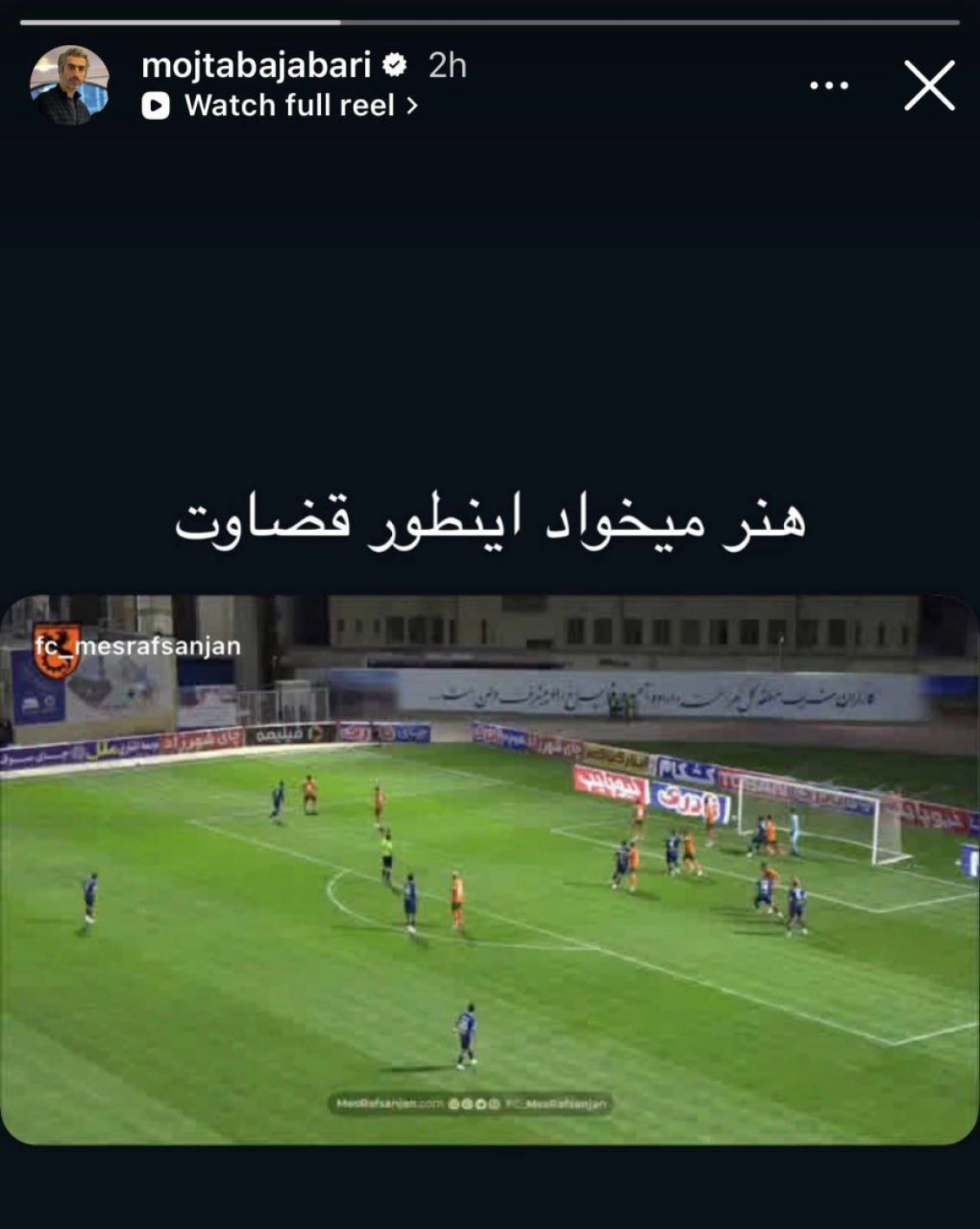 مجتبی جباری، سرمربی مس رفسنجان که نخستین باخت خود را روی نیمکت این تیم تجربه کرد، با انتشار تصویری از بازی دیشب در صفحه شخصی خود، به قضاوت داور واکنش نشان داد. او در این پست نوشت: «اینطور قضاوت هنر میخواهد!»