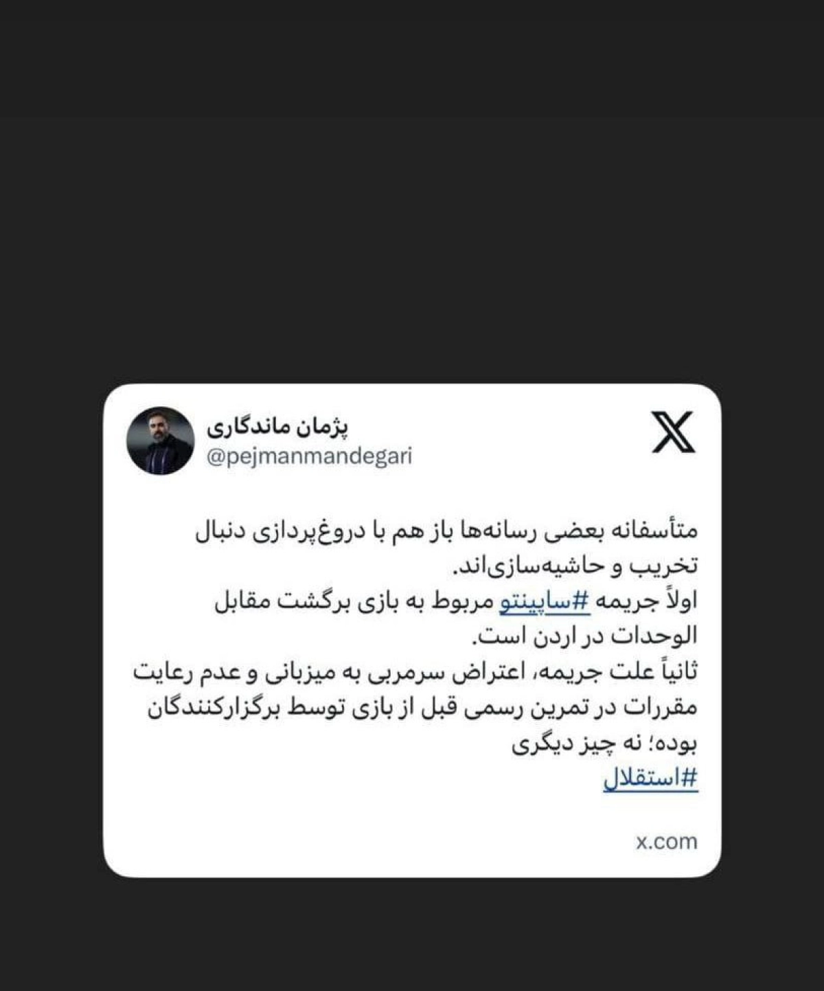 پژمان ماندگاری در استوری اینستاگرام خود به تشریح دلایل جریمه ساپینتو پرداخت و اعلام کرد: «علت جریمه ساپینتو، اعتراض به میزبانی و عدم رعایت مقررات در تمرین رسمی قبل از بازی توسط برگزارکنندگان بوده است.»