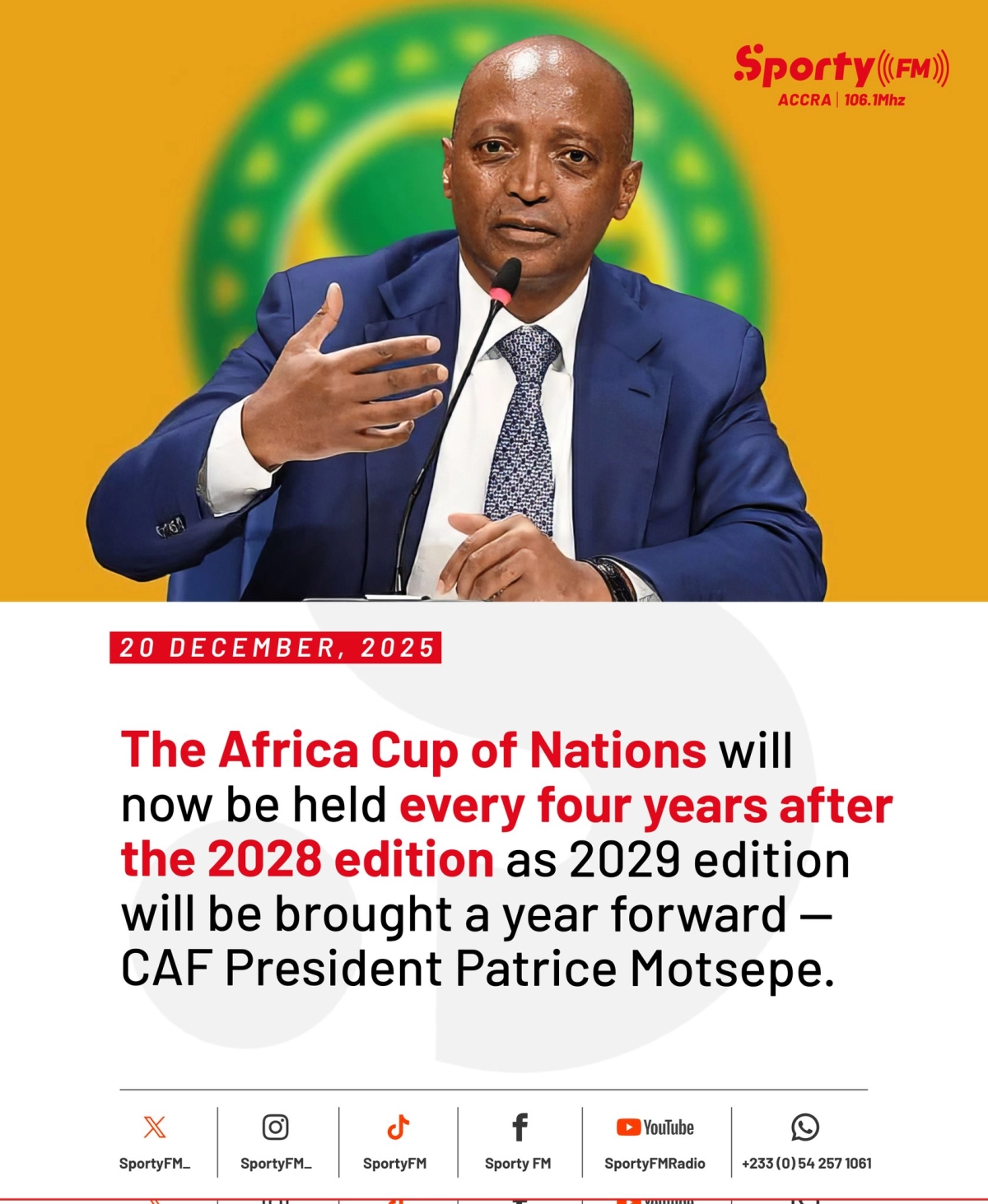 به گزارش بیبیسی، کنفدراسیون فوتبال آفریقا تصمیم گرفته پس از برگزاری جام ملتهای ۲۰۲۷ در شرق آفریقا به میزبانی مشترک کنیا، تانزانیا و اوگاندا، یک دوره دیگر نیز در سال ۲۰۲۸ برگزار کند. پس از آن، این رقابتها بهطور رسمی وارد چرخه چهار ساله خواهند شد؛ تغییری که میتواند تأثیر قابل توجهی بر تقویم فوتبال قارهای و جهانی داشته باشد.