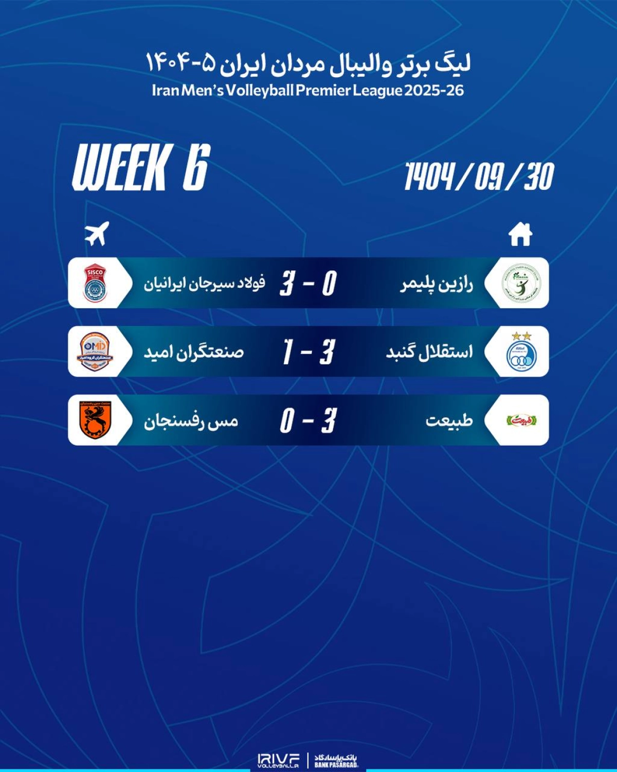 به گزارش سایت رسمی فوتبال برتر ؛ هفته ششم رقابت‌های لیگ برتر والیبال پیگیری شد.