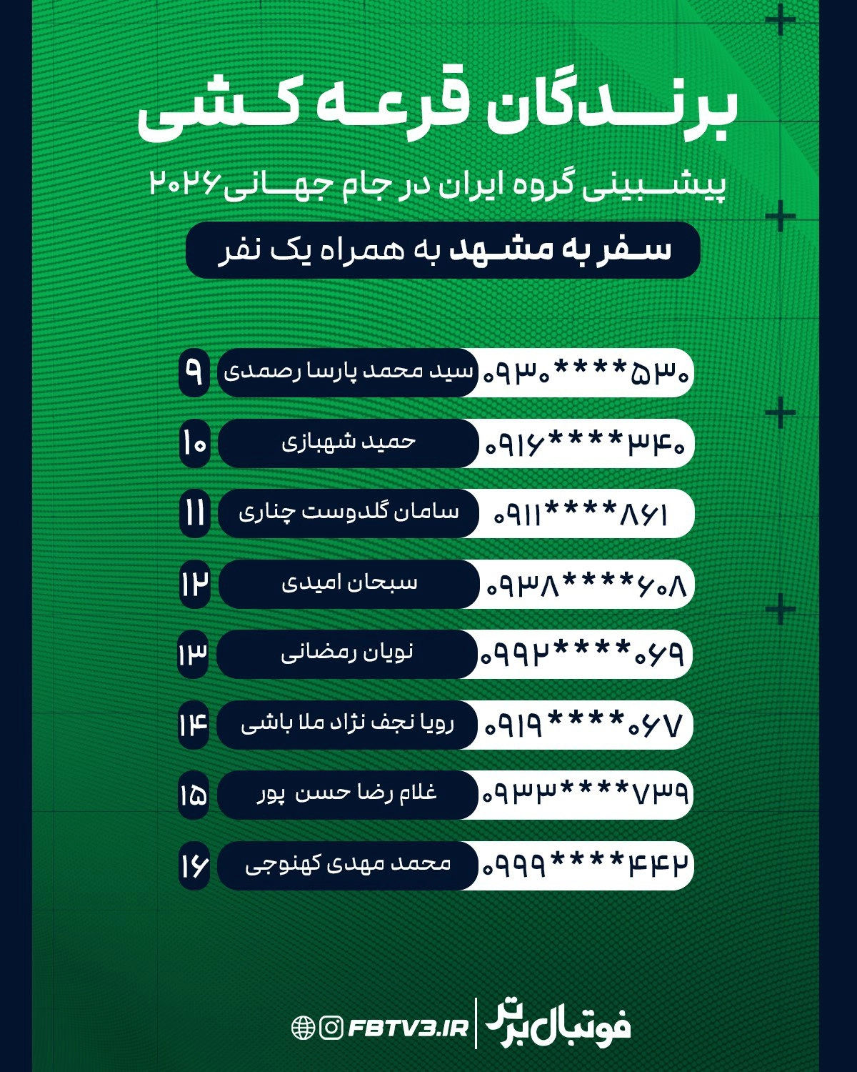 اسامی برندگان قرعهکشی پیشبینی گروه ایران در جام جهانی ۲۰۲۶؛ برنده سفر به مشهد به همراه یک نفر :