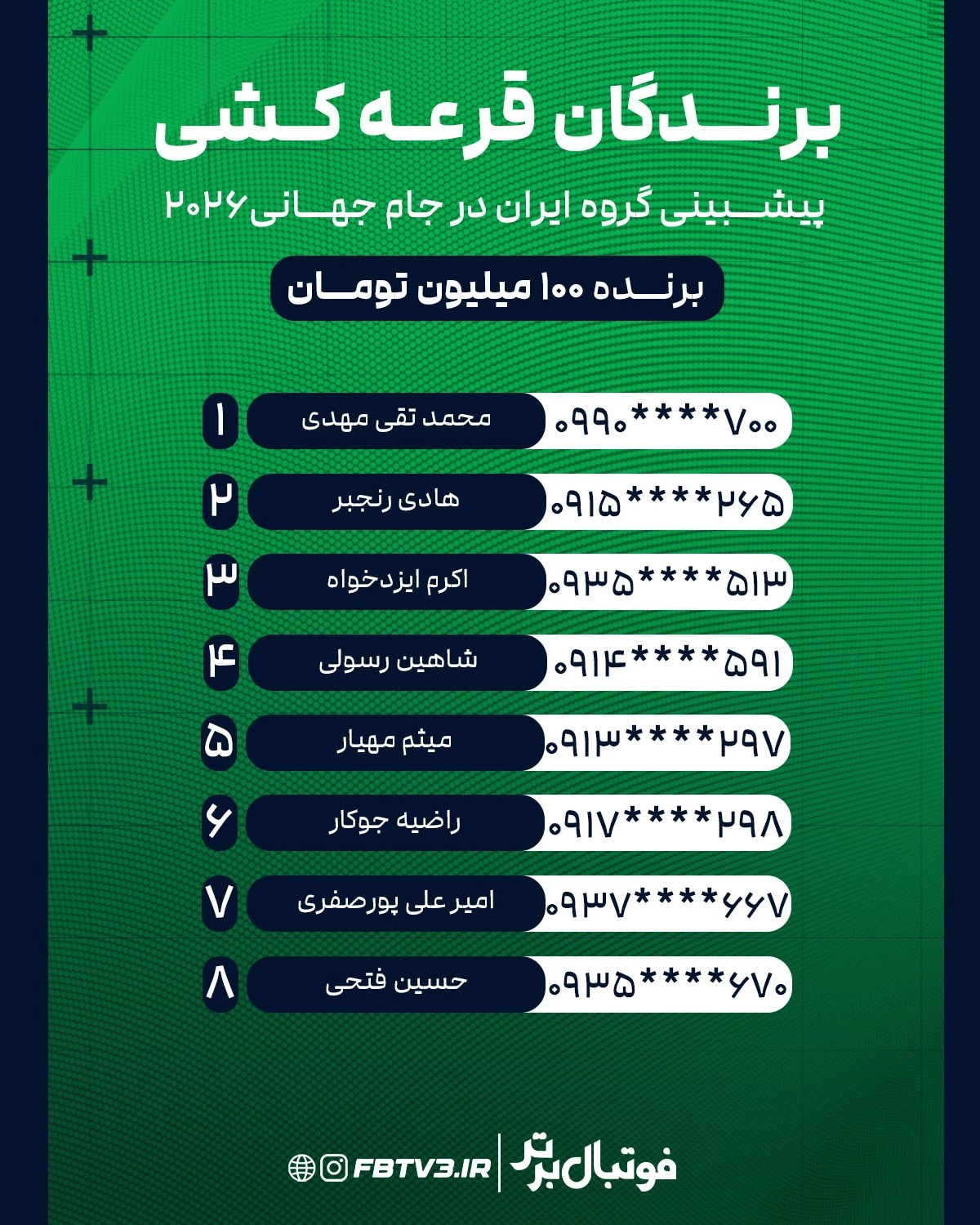 اسامی برندگان قرعهکشی پیشبینی گروه ایران در جام جهانی ۲۰۲۶؛ برنده ۱۰۰ میلیون تومان