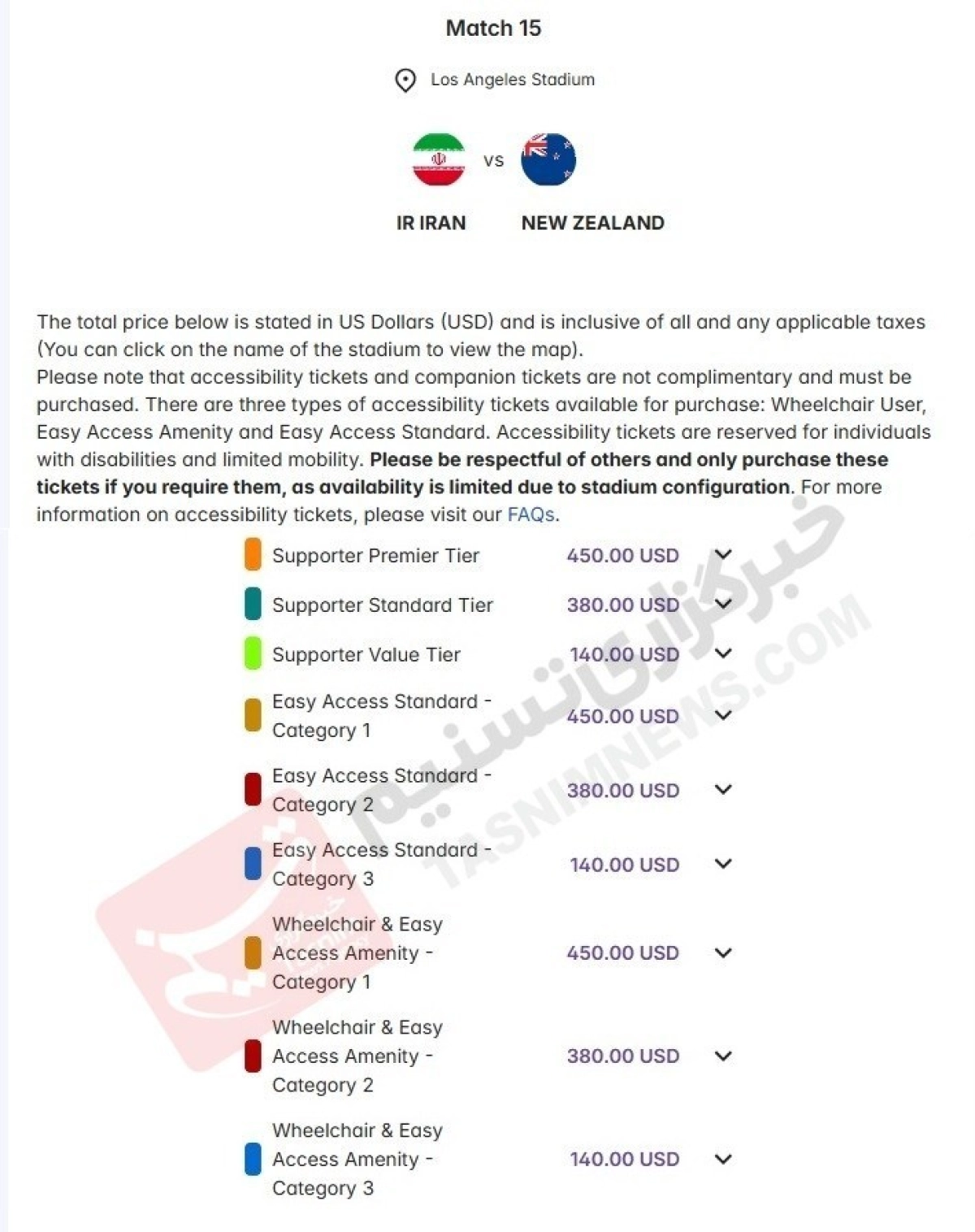 بر اساس اعلام فیفا، بلیت‌ بازی‌ ایران و نیوزیلند براساس دسته‌بندی و جایگاه 140 دلار، 380 دلار و 450 دلار است.