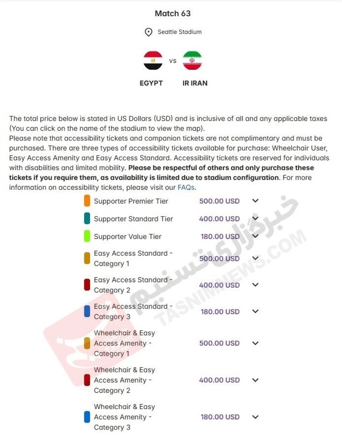 قیمت بلیت‌های دیدار پایانی تیم ملی در مرحله گروهی که مقابل مصر خواهد بود، 180 دلار، 400 دلار و 500 دلار تعیین شده است.