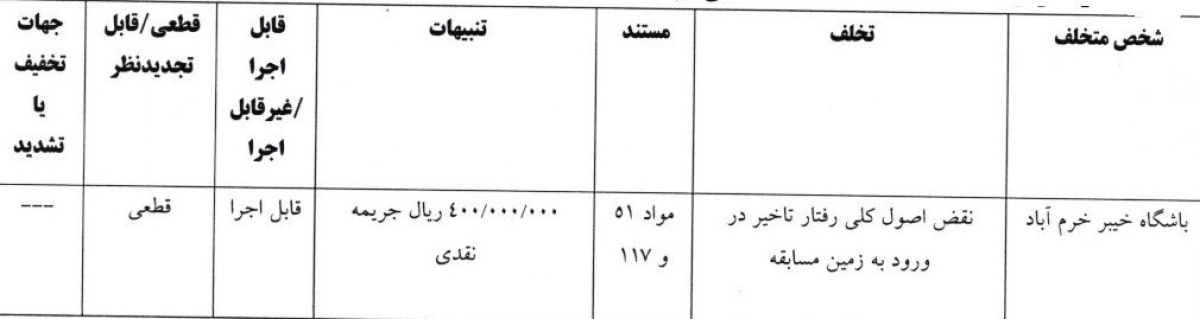رای تخلف باشگاه خیبر مقابل مس رفسنجان به شرح زیر است: