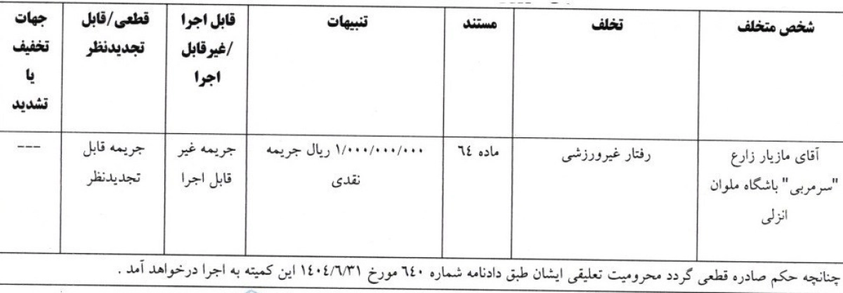 رای تخلف آقای مازیار زارع سرمربی باشگاه ملوان مقابل تیم سپاهان به شرح زیر است: