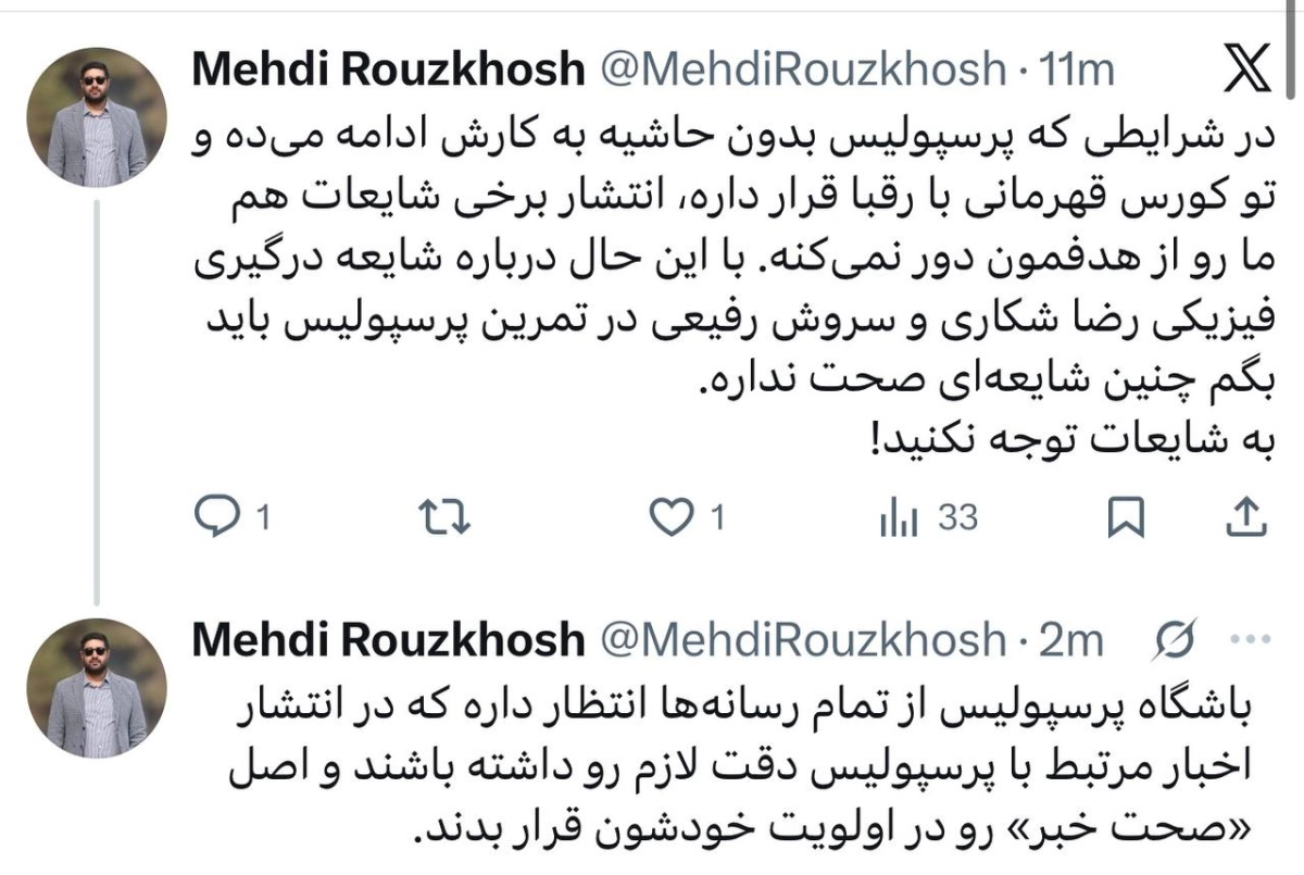 مهدی روزخوش، مدیر رسانه ای باشگاه پرسپولیس، در صفحه شخصی خود در شبکه اجتماعی ایکس (توییتر سابق) به شایعات اخیر پیرامون درگیری فیزیکی بین رضا شکاری و سروش رفیعی در تمرین تیم واکنش نشان داد. او با رد صریح این ادعاها، خواستار توجه رسانه‌ها به صحت اخبار منتشر شده شد.