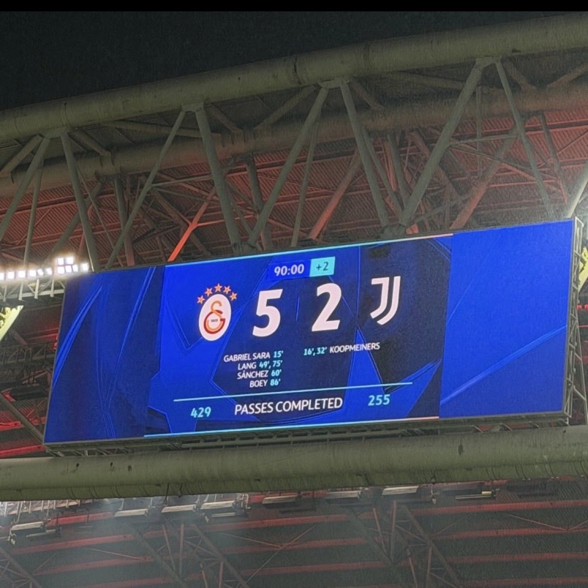 ۲: بانوی پیر در تاریخ حضورش در مسابقات قاره‌ای، تنها برای دومین بار در یک بازی حداقل پنج گل دریافت کرده است. تنها اتفاق مشابه به فصل ۵۹-۱۹۵۸ جام باشگاه‌های اروپا برمی‌گردد؛ جایی که یووه با نتیجه سنگین ۷ بر صفر مقابل وینر اشپورت کلوب شکست خورد. این آمار، یکی از بدترین شب‌های تاریخ اروپایی بیانکونری را دوباره یادآوری می‌کند.