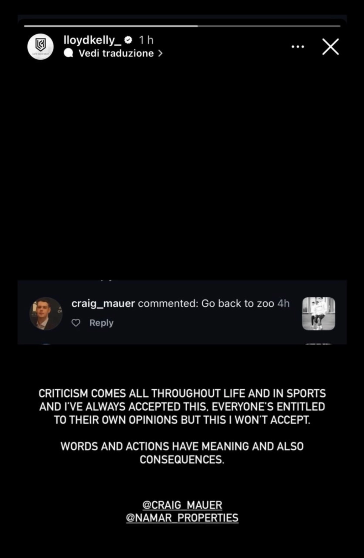 کلی نیز با انتشار پیامی در صفحه شخصیاش نوشت: «همیشه در جریان زندگی و ورزش انتقادات وجود دارند و همیشه این را پذیرفتهام. هرکس در ابراز عقاید خودش آزاد است اما چنین چیزی را نمیپذیرم. کلمات و اقدامات، معنی و عواقب خودشان را دارند.»