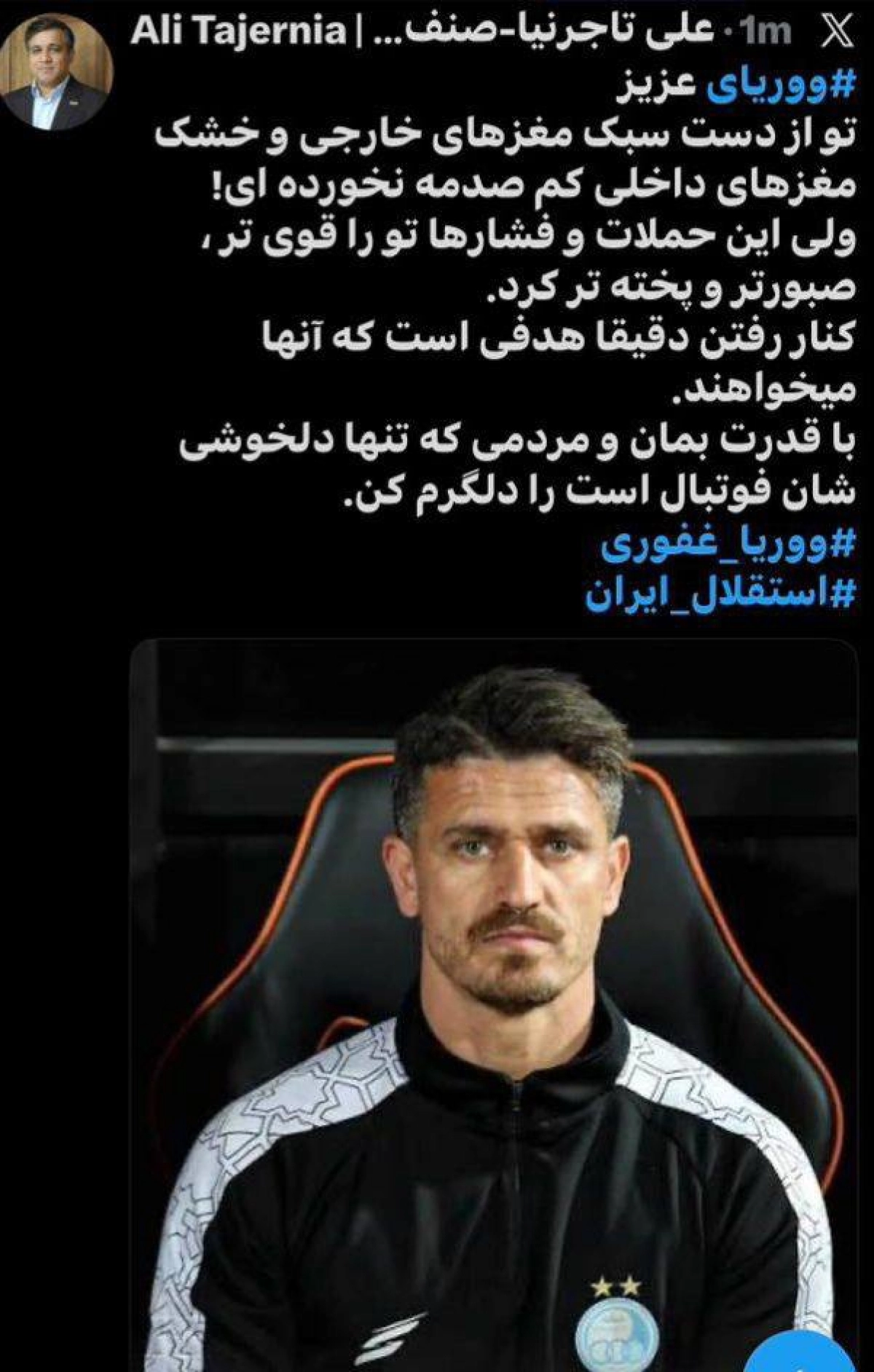 در حالی که خبر کنارهگیری وریا غفوری فضای استقلال را ملتهب کرده، علی تاجرنیا با انتشار پیامی صریح از کاپیتان سابق آبیها خواسته از تصمیم خود صرفنظر کند؛ تلاشی علنی برای حفظ چهرهای که این روزها در کانون حاشیهها قرار گرفته است.