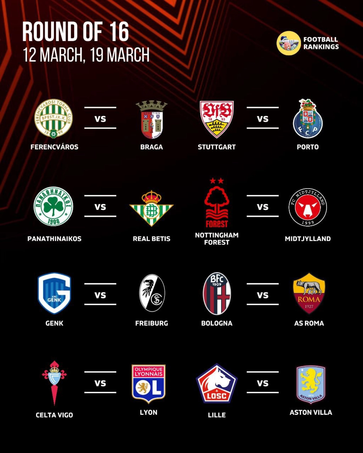 پس از برگزاری قرعهکشی مرحله یک هشتم نهایی لیگ قهرمانان اروپا، یوفا یک ساعت پس از این مراسم، مراسم قرعهکشی مرحله حذفی لیگ اروپا را هم برگزار کرد و تیمها به این شکل رقبای خود در مرحله یک هشتم نهایی را شناختند: